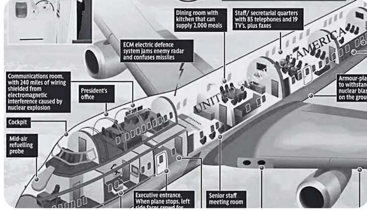 - സഞ്ചരിക്കുന്ന വൈറ്റ് ഹൗസ്: പ്രസിഡന്റിന് ആവശ്യമായ എല്ലാ സൗകര്യങ്ങളും ഇവിടെയുണ്ട്. ഒരു മിനി ഓപ്പറേഷൻ തിയേറ്റർ, ഡോക്ടർമാരുടെ സേവനം, അത്യാധുനിക കമ്മ്യൂണിക്കേഷൻ സെന്റർ എന്നിവ ഇതിന്റെ ഭാഗമാണ്. കടലിലായാലും ആകാശത്തായാലും ലോകത്തെവിടെയുമുള്ള സൈനികരുമായി ആശയവിനിമയം നടത്താൻ ഈ വിമാനത്തിലിരുന്ന് സാധിക്കും.